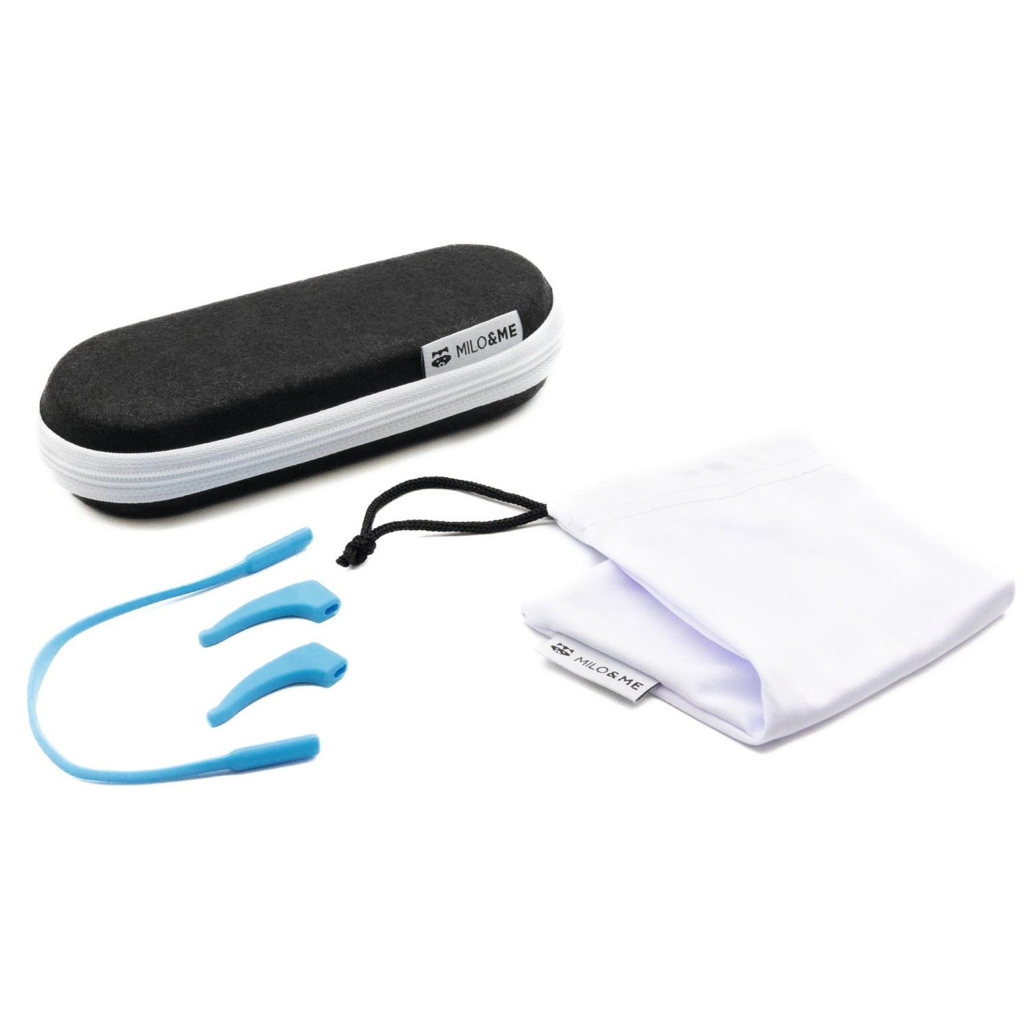 W zestawie znajdziesz także woreczek z mikrofibry do czyszczenia okularów, opaskę elastyczną na głowę do lepszego dopasowania, stopery do regulacji długości zauszników, etui do przechowywania okularów i naklejkę z logo Milo & Me.